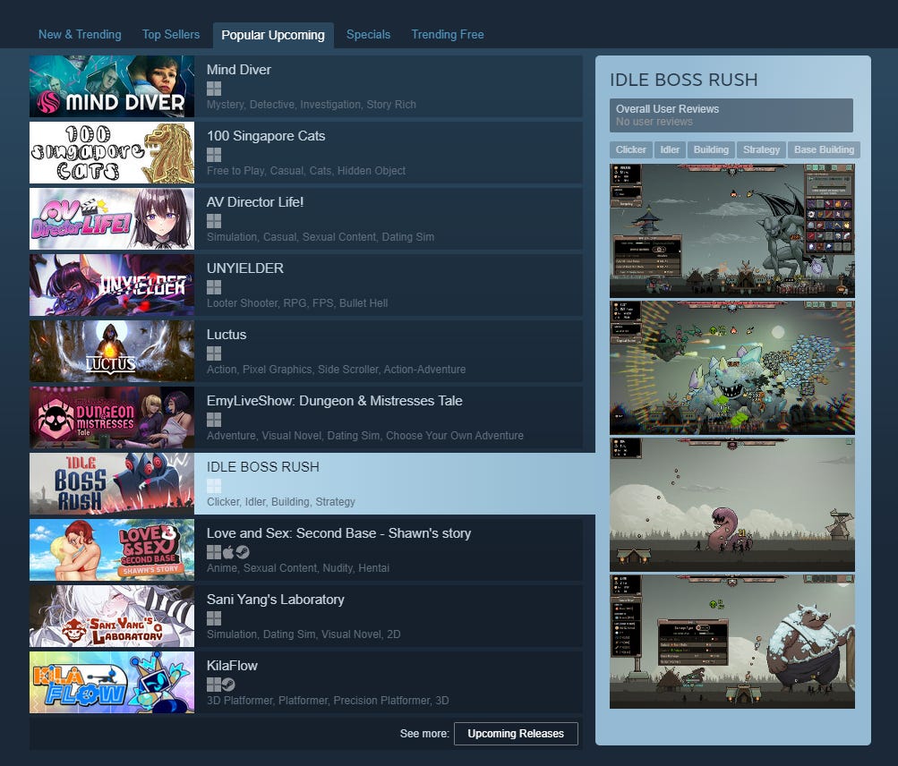 So how do you break through? IDLE BOSS RUSH presents us with one possible strategy: a clear and obvious name that immediately positions your game within a genre. I don’t even have to look at the game description to understand what it is. I like the naming formula here of [GENRE] [CONCEPT]. This is something that games in the simulator genre have been doing for a while. Chris Zukowski has written about the importance of a clear name saying: